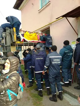 Коростенські рятувальники спільно з медичним центром виготовили спеціальний пристрій та засоби, а одне з місцевих підприємств надало вивантажувач, за допомогою якого 60 чоловіків транспортували хвору через вікно квартири на вулицю.