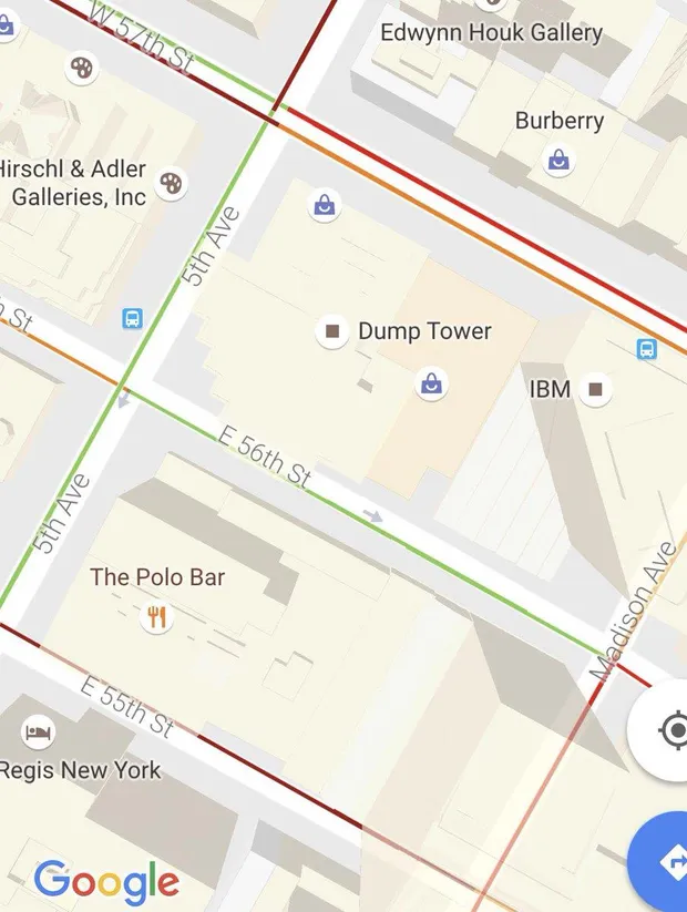 Відкривши мапу, замість назви 58-поверхового хмарочоса новообраного президента США Trump Tower, що в перекладі означає "Вежа Трампа", з'явився напис Dump Tower – "Вежа Звалище". В Мережі вже почали видозмінювати й цю назву, вживаючи вираз "Звалище Трампа".