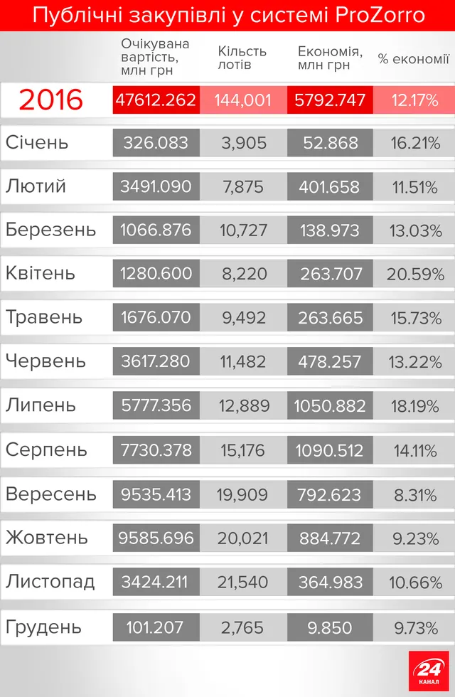 За 12 місяців (у статистиці, наданій сайту "24" ProZorro, враховувались всі завершені та конкурентні процедури в період з 1 січня до 21 грудня 2016 року) вдалось зекономити 5 792 747 087,65 гривні – понад 12% від очікуваної вартості товарів та послуг. У відсотковому вимірі "найекономнішим" виявився квітень, у грошовому еквіваленті – серпень 2016 року.