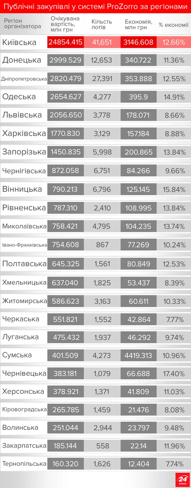 У географічному вимірі жодних несподіванок – лідером за зекономленою сумою, як і за кількістю торгів, виявився Київ. А от після нього за сумою економії – Одещина, а за відсотком зекономлених грошей несподівано опинилась Чернівецька область – понад 17% економії.