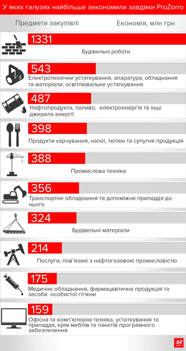 Найбільше державним та комунальним підприємствам вдалось у 2016 році зекономити на будівельних роботах – 1,3 мільярда гривень. На другому місці, з величезним відставанням – електротехнічне устаткування, апаратура, обладнання та матеріали, а також освітлювальне устаткування.