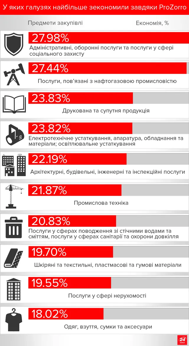 А от у відсотковому вимірі найбільше вдалось зекономити на адміністративних, оборонних послугах та послугах у сфері соціального захисту – кожну четверту гривню, а точніше – 27,98%. У трійці також послуги, пов'язані з нафтогазовою промисловістю, а також друкована і супутня продукція.