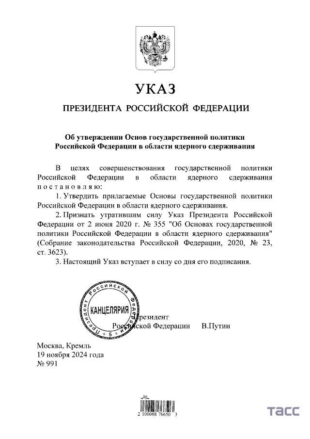 24 Канал з посиланням на російських пропагандистів пише, що документ Путін підписав 19 листопада 2024 року. У ньому мовиться, що рішення про застосування ядерної зброї ухвалює Путін.