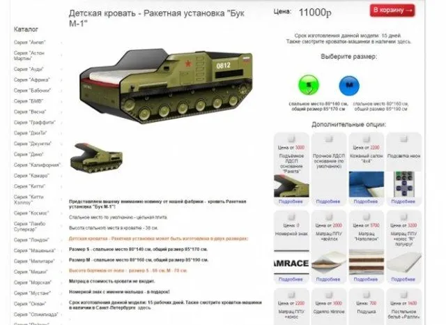 В России в продажу поступили детские кроватки в форме ракетной установки "Бук М-1". Соцсети саркастически восприняли такую новость и спрашивают не продают ли в комплекте люстру "Боинг".