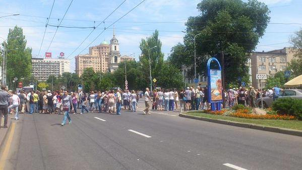 Приехавший под ОГА #Донецк Захарченко оттянул жителей с проезжей части. Говорит с мирными, рядом охрана. Они слушают,но часто перебивают.