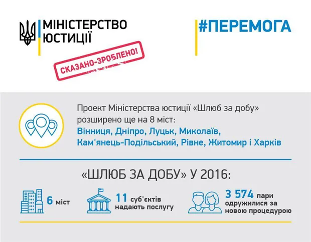 Якщо в перший рік до пілотного проекту долучилися лише 6 міст – Київ, Львів, Одеса, Херсон, Маріуполь та Сєвєродонецьк, то з 2017 року одружитися за новою швидкою й зручною процедурою можна у Вінниці, Дніпрі, Луцьку, Миколаєві, Кам’янці-Подільському, Рівному, Житомирі та Харкові.