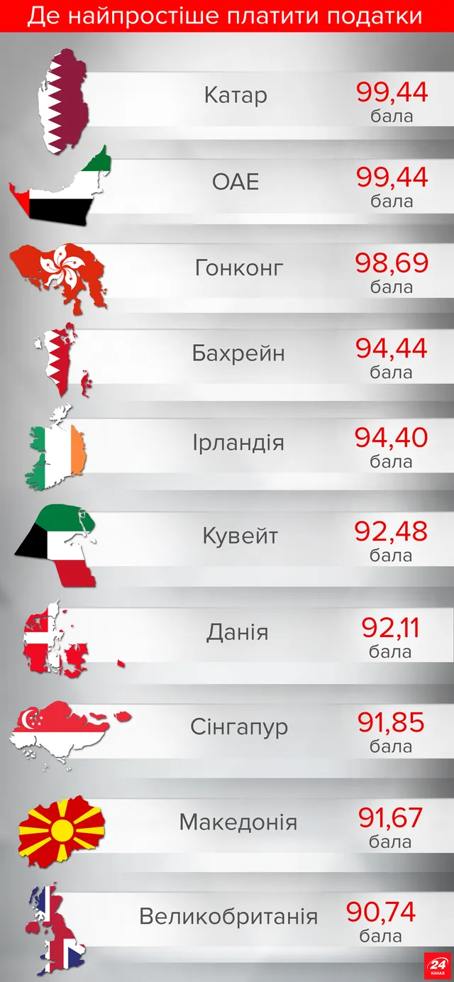 Так, за даними нещодавно опублікованого рейтингу Paying Taxes 2017, у якому порівнювались податкові системи 190 країн світу, перше місце поділили дві аравійські країни – Катар та Об'єднані Арабські Емірати з показником 99,44 бала (зі 100 можливих). Доповнив трійку Гонконг, а найкращою європейською країною стала Ірландія.
