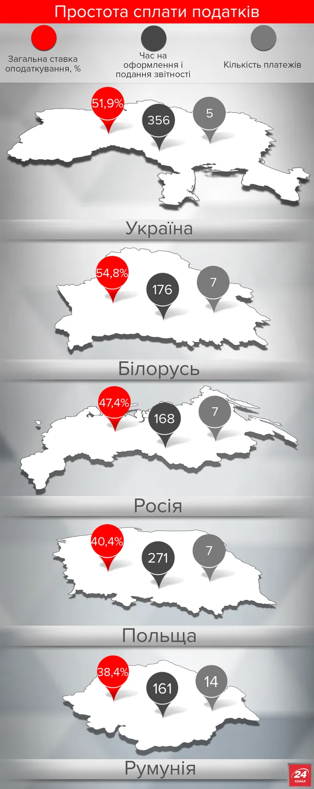 У порівнянні з сусідами, в Україні доводиться витратити багато часу на оформлення та подання звітності – 356 годин (в Румунії, наприклад, на це піде лише 161 година). За цим показником у світі лідер – ОАЕ, там вам для цього знадобиться лише 12 годин.