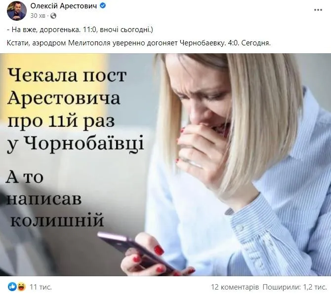 До свого допису Арестович додав мем про Чорнобаївку.