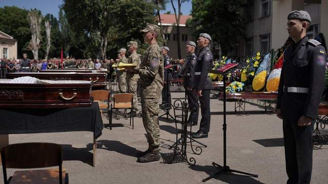 19:56 В Одесі попрощалися із загиблими від ракетного удару 23 липня офіцерами, а також командиром 28 окремої механізованої бригади імені Лицарів Зимового Походу. До місця прощання 26 липня прийшли кілька сотень людей з оберемками червоних троянд, букетами гвоздик та синьо-жовтих айстр.