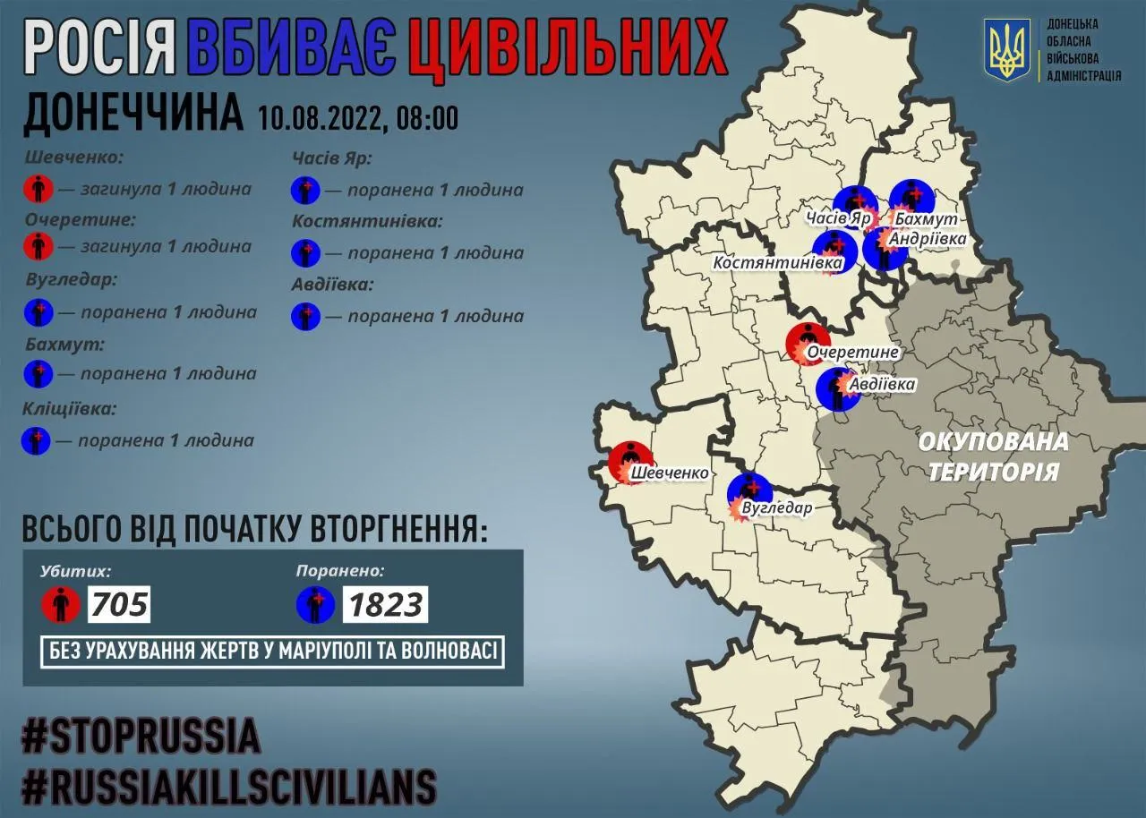 08:01 Глава Донецької ОВА Павло Кириленко розповів, що 9 серпня російські військові вбили двох мирних мешканців області: в Очеретиному та Шевченку. Відомо також про 6 людей, які зазнали поранень.
