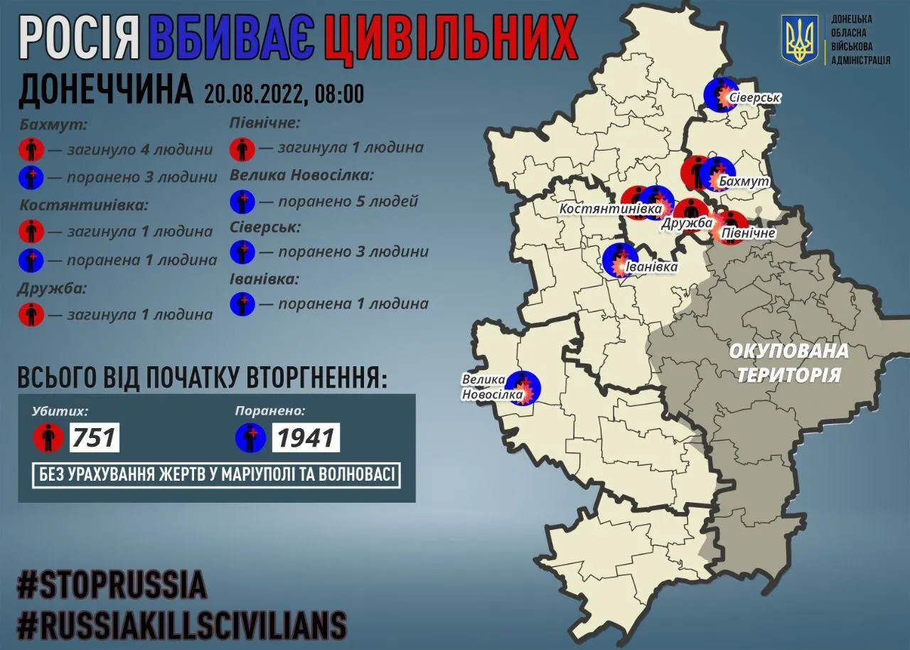 07:59 Глава Донецької ОВА Павло Кириленко повідомив, що за 19 серпня окупанти забрали життя 7 мирних мешканців області: