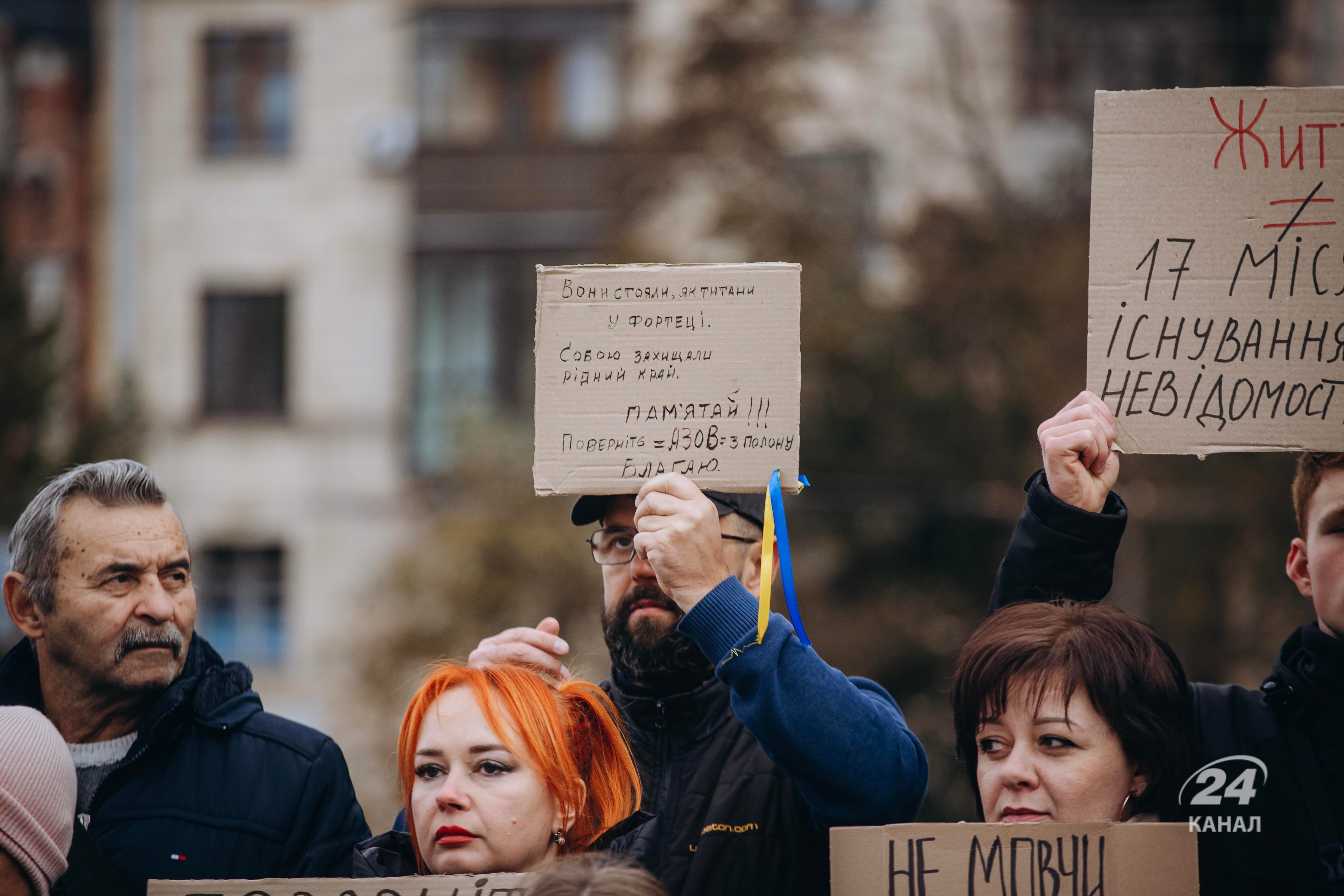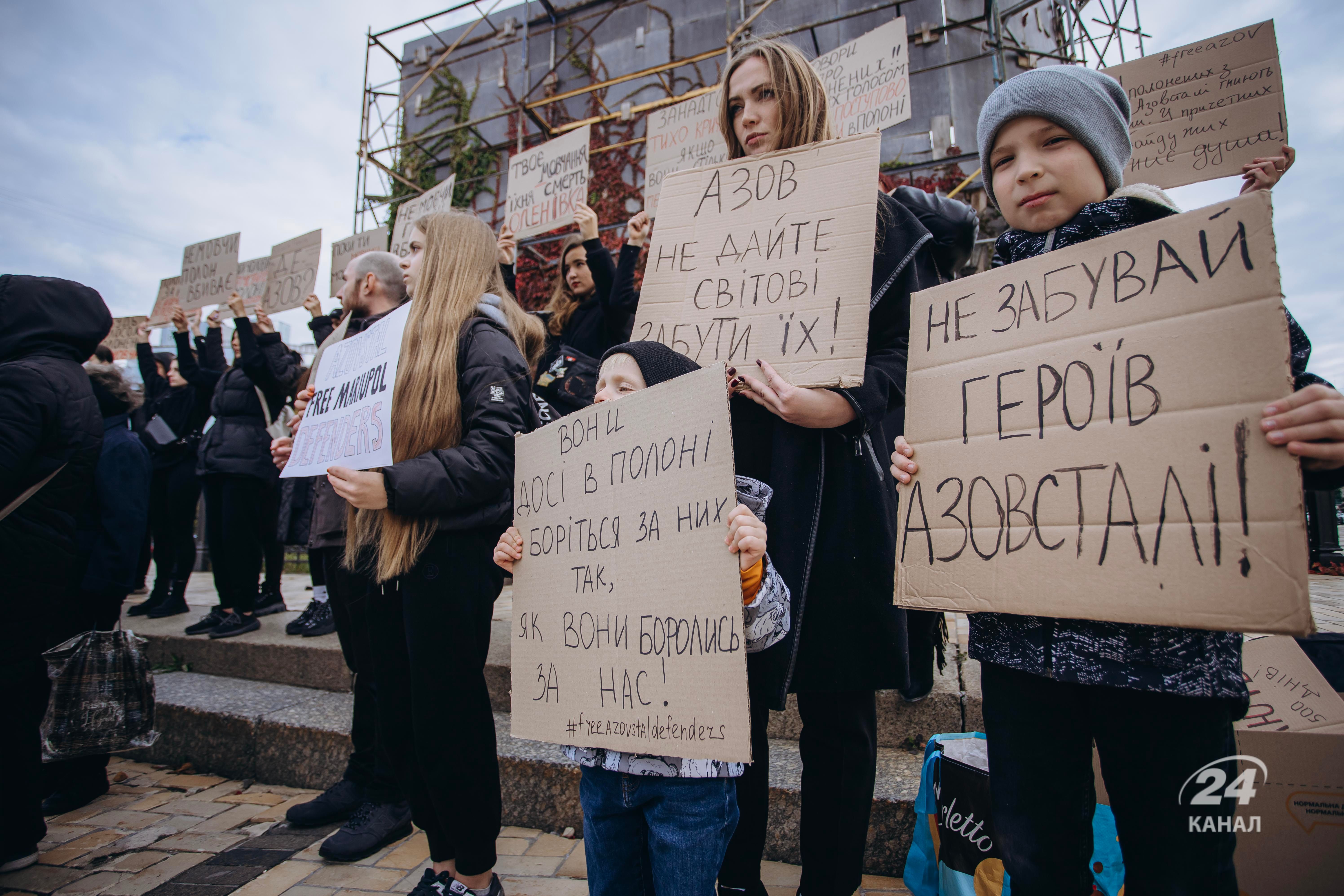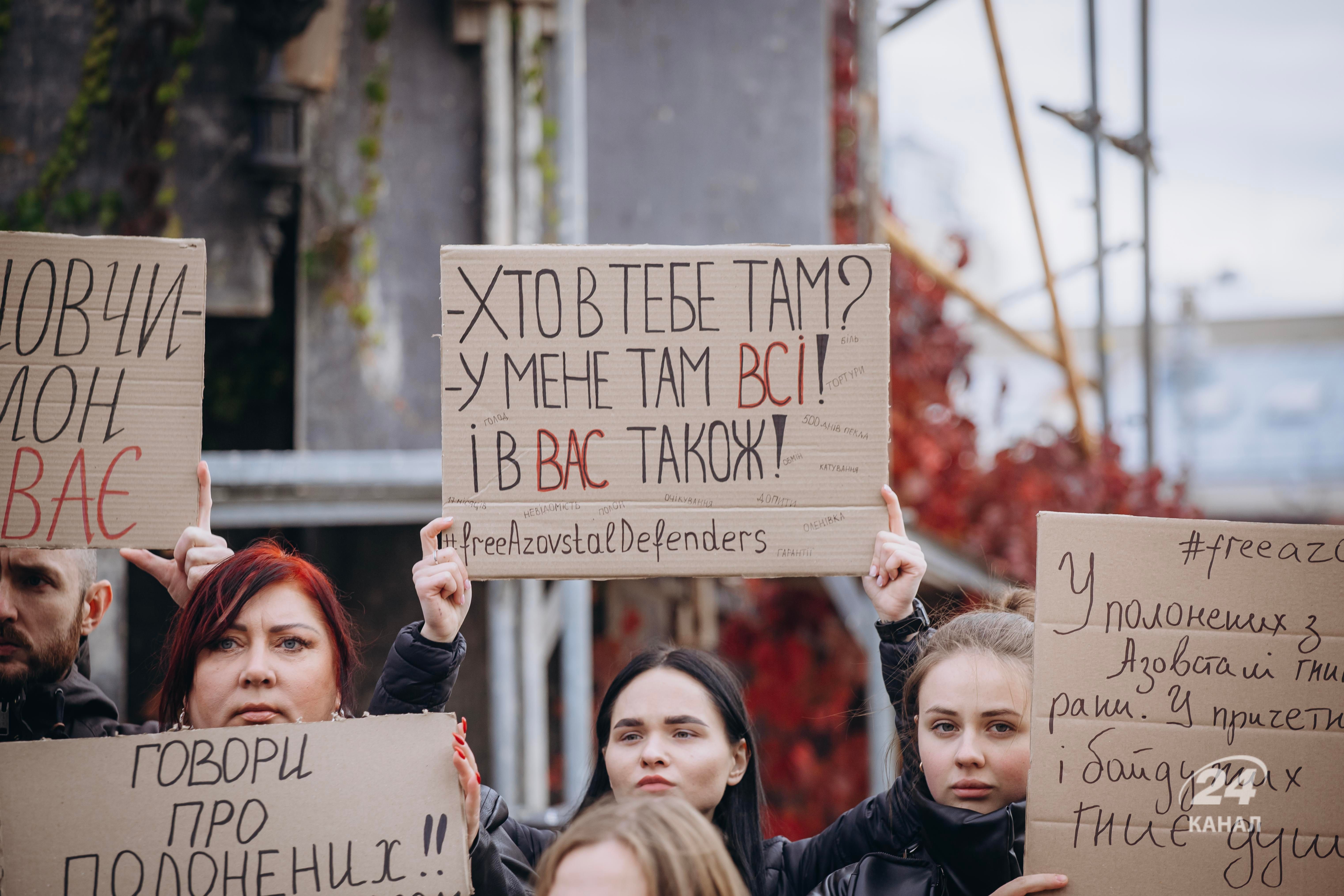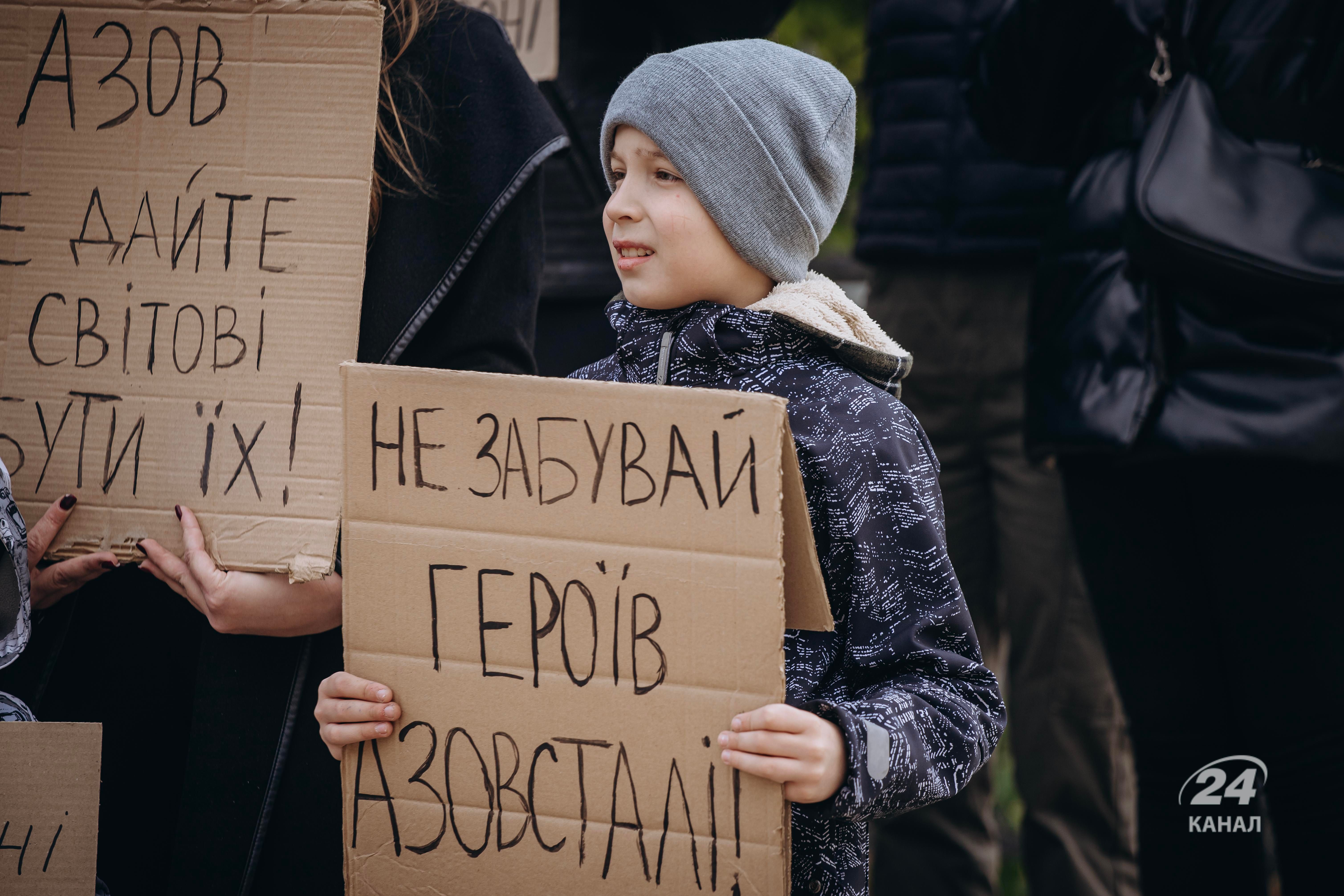 На цій акції були присутніми понад 50 активістів: батьки, сестри, діти та побратими полонених оборонців "Азовсталі". Усі вони стояли на Софіївській площі та тримали у руках плакати з різними написами: