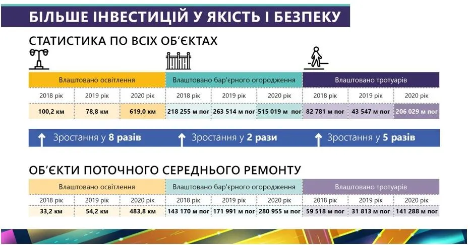 Крім того, у 2020 році Укравтодор приділяв увагу посиленню безпеки дорожнього руху. У порівнянні з попередніми роками було зроблено в кілька разів більше освітлення, бар’єрного огородження і тротуарів.