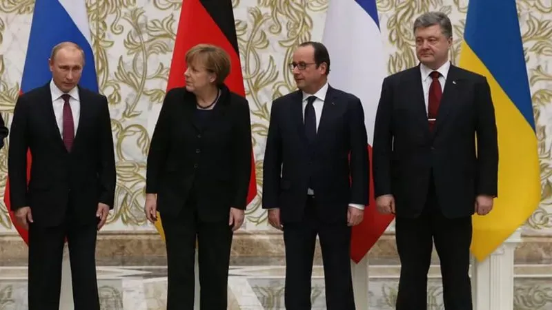У 2015 році Володимир Путін, Ангела Меркель, Франсуа Олланд та Петро Порошенко підписали декларацію на підтримку "комплексу заходів щодо виконання мінських угод" / фото Getty Images