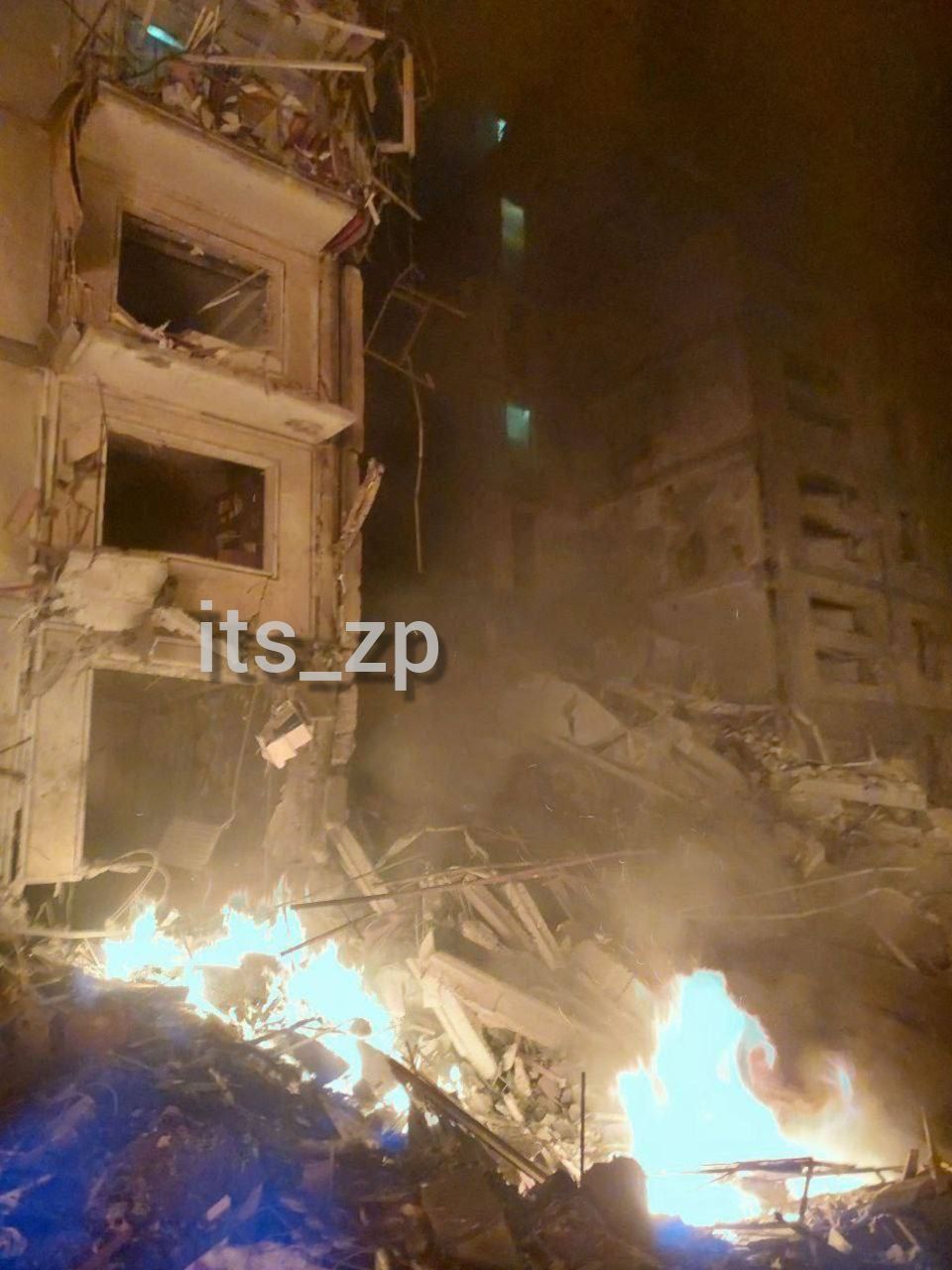 05:16 Голова Запорізької ОВА Олександр Старух уточнив, що у зруйнованій багатоповерхівці в Запоріжжі є постраждалі. У міській владі додали, що наразі відомо про чотирьох, і що зафіксовані пожежі.
