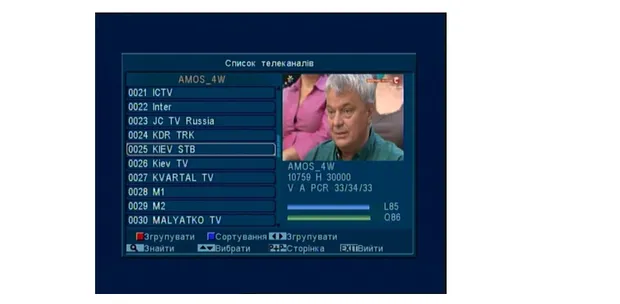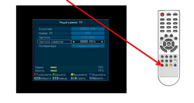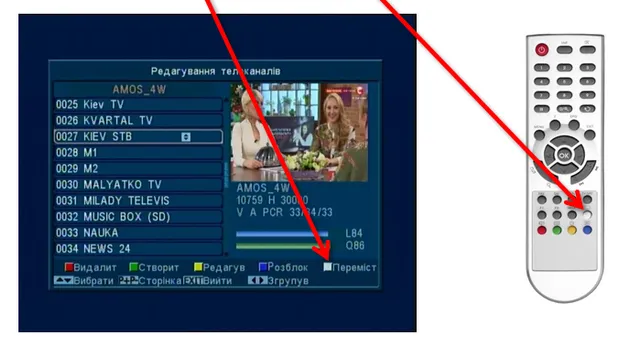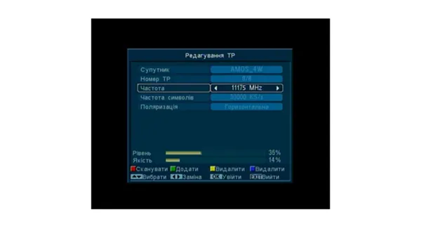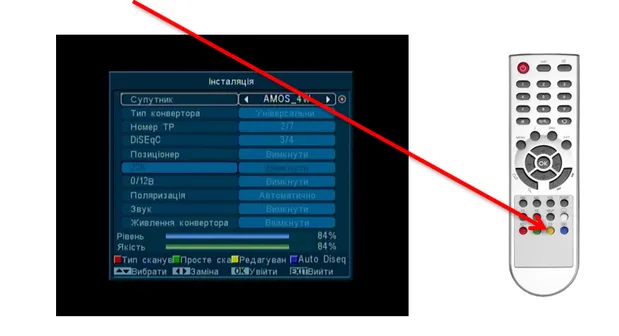 4. У пункті меню "Супутник", кнопками "Ліворуч/Праворуч" знайдіть супутник "AMOS_4W" та натисніть зелену кнопку пульта.