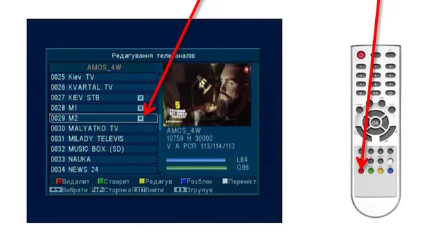 4. Кнопками пульта "Вгору/Вниз" виберіть канал для видалення та натисніть червону кнопку.