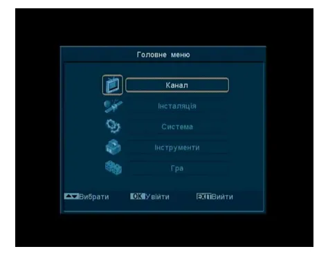 2. В головному меню кнопкою пульта "Вниз" спочатку виберіть меню "Інсталяція" та натисніть "ОК".