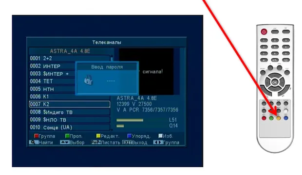 2. Для редагування списку каналів натисніть жовту кнопку пульта та введіть пароль (зазвичай він 0000).