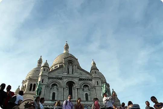 Не побувати на Монмартрі — я б собі такого не пробачив. Бо якщо Ейфелева вежа — це висота штучна, то тут її 130 метрів природньої. І це ж найвища точка міста, у північній його частині. Уже після виходу з метро, коли залишилось пройтись пішки, купили трохи їжі, щоб на пагорбі влаштувати собі пікнік. А тут, біля базиліки Сакре-Кер — уже спражнє тобі туристичне паломництво. На окупованих сходах знайшли і собі місце. Хліба і видовищ!? Хліб у нас є, а сьогоднішнє видовище — це цілий Париж. Базиліка — за спиною.