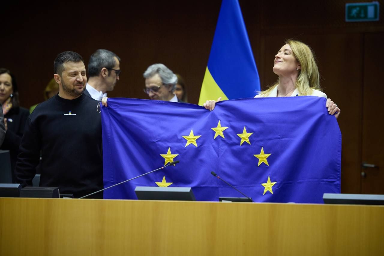 11:58 Зеленський разом з головою ЄП Робертою Мецолою прослухали гімн України та гімн Євросоюзу. Вони звучали перед промовою нашого президента в Європарламенті.