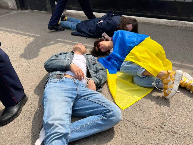 14:06 У Казахстані люди прийшли на протест з українськими прапорами під посольство Росії, щоб вшанувати пам'ять жертв воєнних злочинів Кремля. Однак їх почали затримувати правоохоронці.
