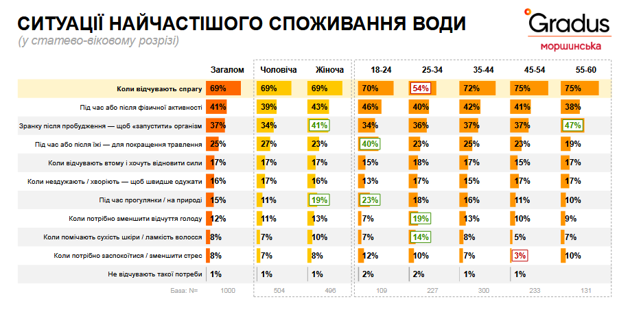 Найчастіше потреба пити воду виникає у відповідь на спрагу (69%). Серед інших поширених ситуацій – фізична активність (41%) та ранок після пробудження, коли вода сприймається як засіб для "запуску" організму (37%).