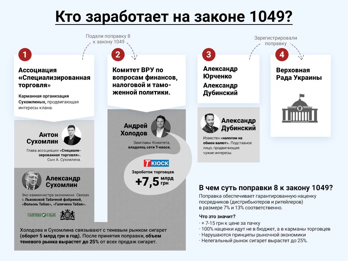 Першоджерелом поправки є Асоціація "Спеціалізована торгівля" – кишенькова організація Олександра Сухомлина, ексзаступник міністра економіки в уряді Азарова. Вона не веде регулярної діяльності і виринає з небуття тільки для того, щоб просувати інтереси Сухомлина. Останнього пов'язують з Львівською тютюновою фабрикою та компаніями "Волиньтабак" і "Галичина Тютюн", а також з тіньовим ринком сигарет, обсяг якого оцінюють в 5 млрд гривень. Головою асоціації "Спеціалізована торгівля" є Антон Сухомлин – син Олександра Сухомлина.