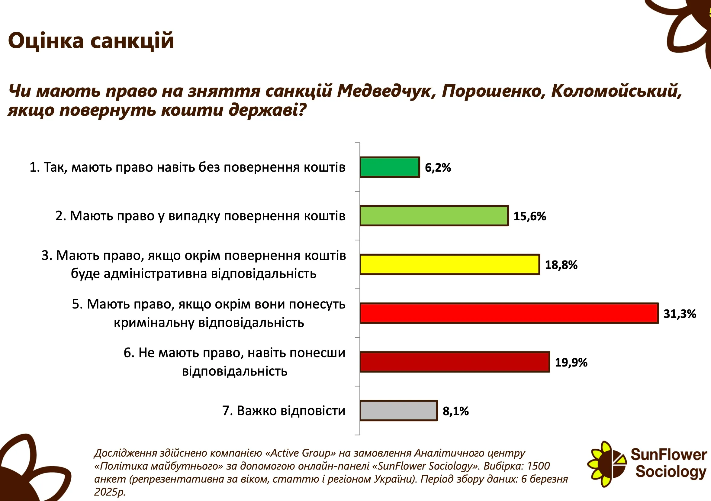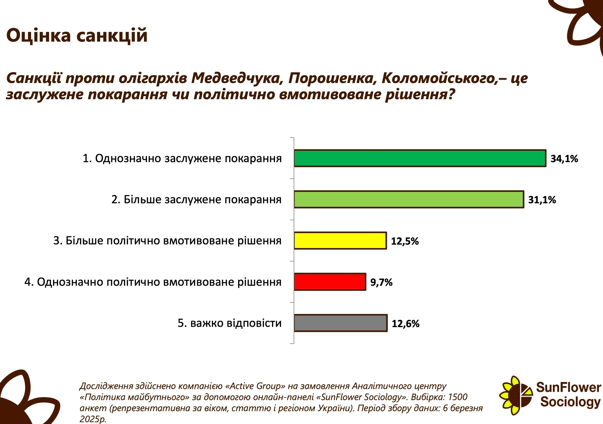 "Санкції проти олігархів Медведчука, Порошенка та Коломойського вважають заслуженим покаранням 65,2% українців, з них 34,1% – "однозначно заслуженим", а 31,1% – "більше заслуженим", – йдеться в результатах дослідження.
