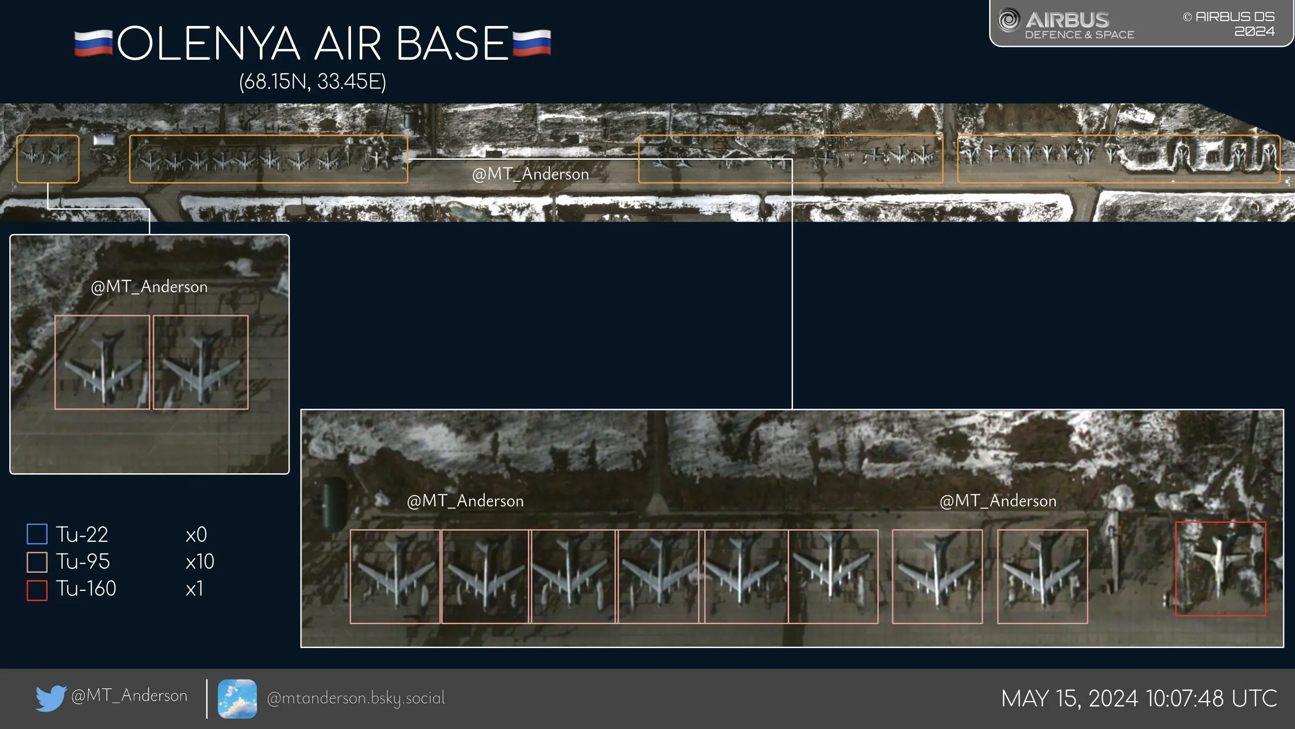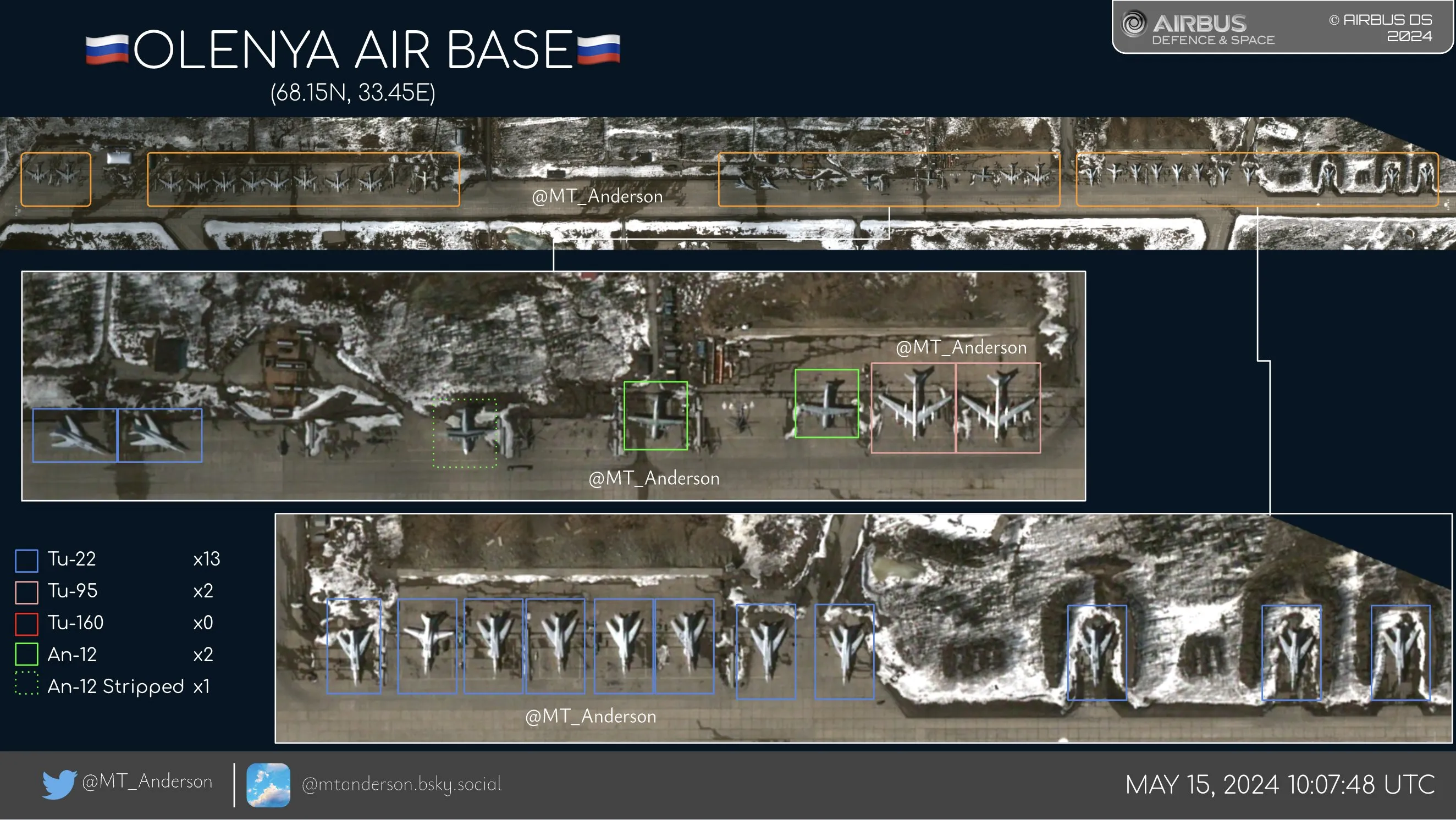 На супутникових знімках від 15 травня 2024 травня зафіксовано десятки ворожих літаків. Як пише аналітик MT Anderson, на аеродромі "Оленья" в Мурманській області перебувало: