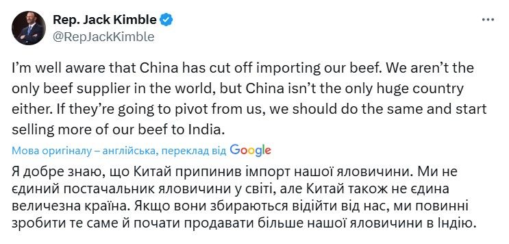 Джек Кімбл запропонував припинити торгову співпрацю з Китаєм щодо постачання яловичини. Раніше в КНР заявили, що більше не будуть купувати цей вид м'яса у США.