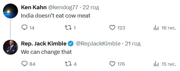 Республіканець запропонував продавати яловичину Індії / Скріншот зі сторінки Джека Кімбла у X