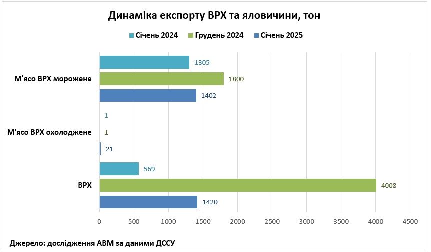 За попередніми даними ДССУ, в січні 2025 року Україна експортувала 1,42 тисячі тонн ВРХ живою вагою, що на 65% менше відносно грудня 2024 року, але на 150% більше відносно січня 2024 року,