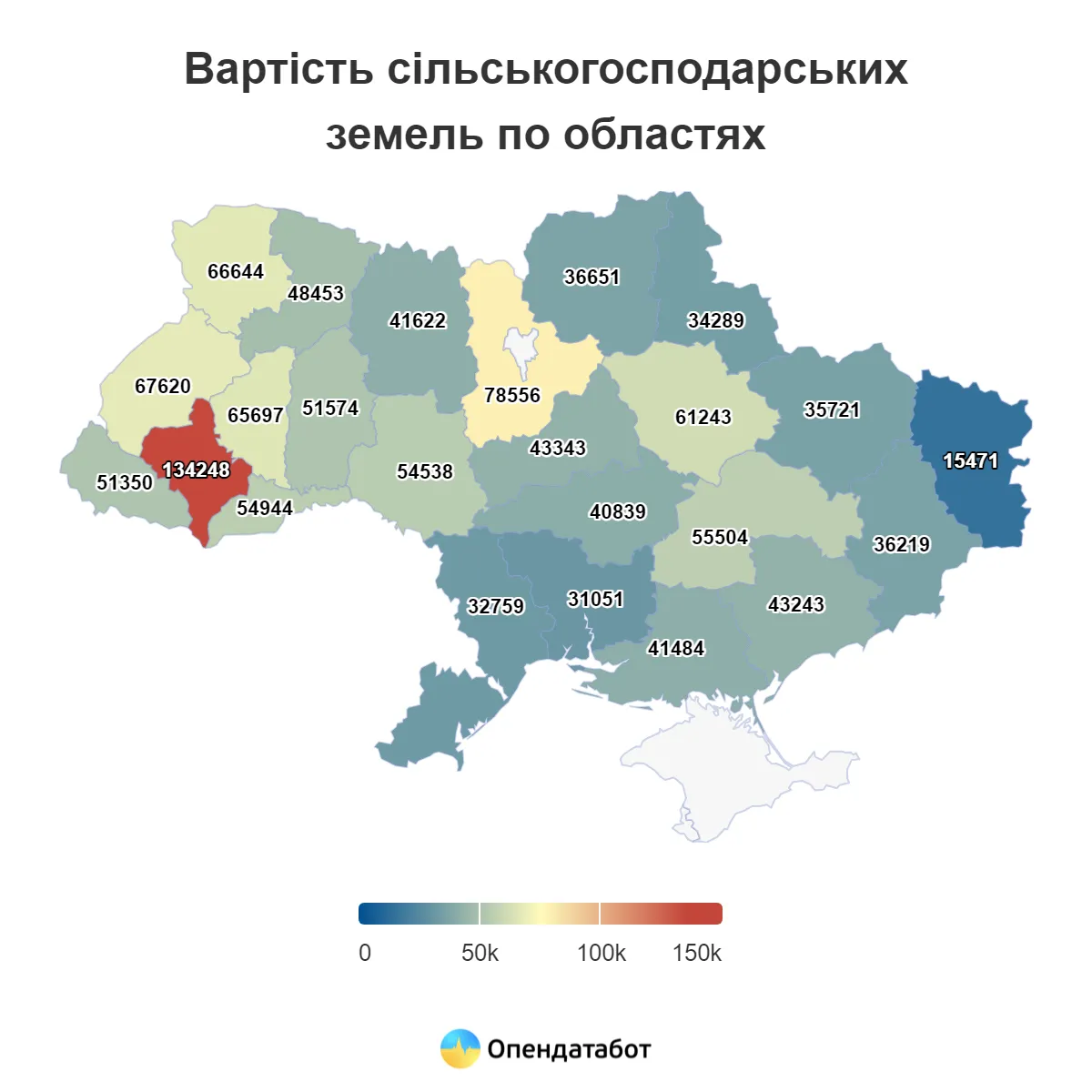 Стоимость 1 сотки земли в Украине возможно лишь индивидуально, учитывая все указанные факторы. Стоимость земли колеблется в зависимости от региона. По состоянию на конец сентября – начало октября 2024 года цены 1 гектара земли составляют от 15 471 в Луганской области до 134 248 гривен за гектар в Ивано-Франковской. Средняя стоимость сейчас составляет 49 045 гривен за гектар.