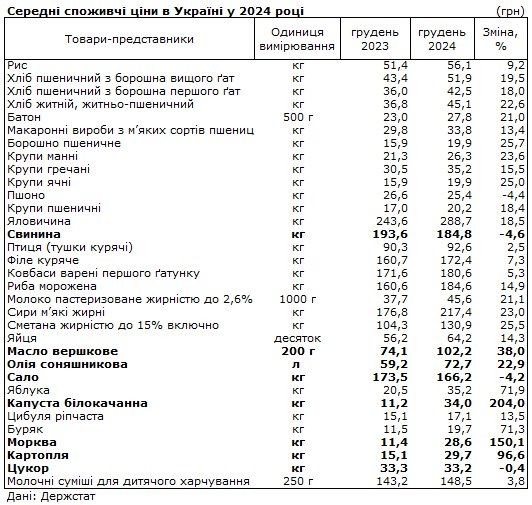 Общий рост цен на продукты в Украине достиг в среднем 14,1% за 2024 год. Больше всего выросла стоимость овощей, молочных продуктов и подсолнечного масла.