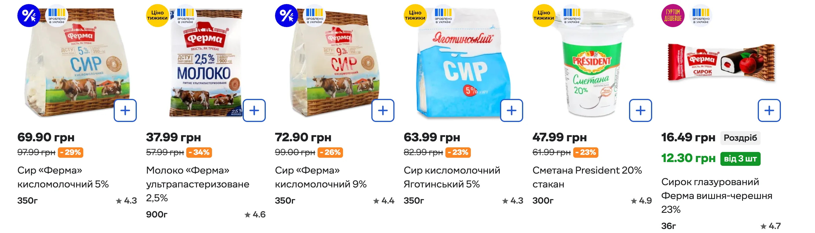 - творог – 69,90 гривен вместо 97,99 гривен (-29% скидки);