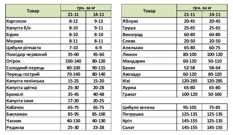 Гранат продавался дороже, чем неделей ранее (100 – 120 гривен за килограмм), а стоимость килограмма авокадо снизилась. Цены на яблоко, груши и виноград сохранились на уровне предыдущей недели.
