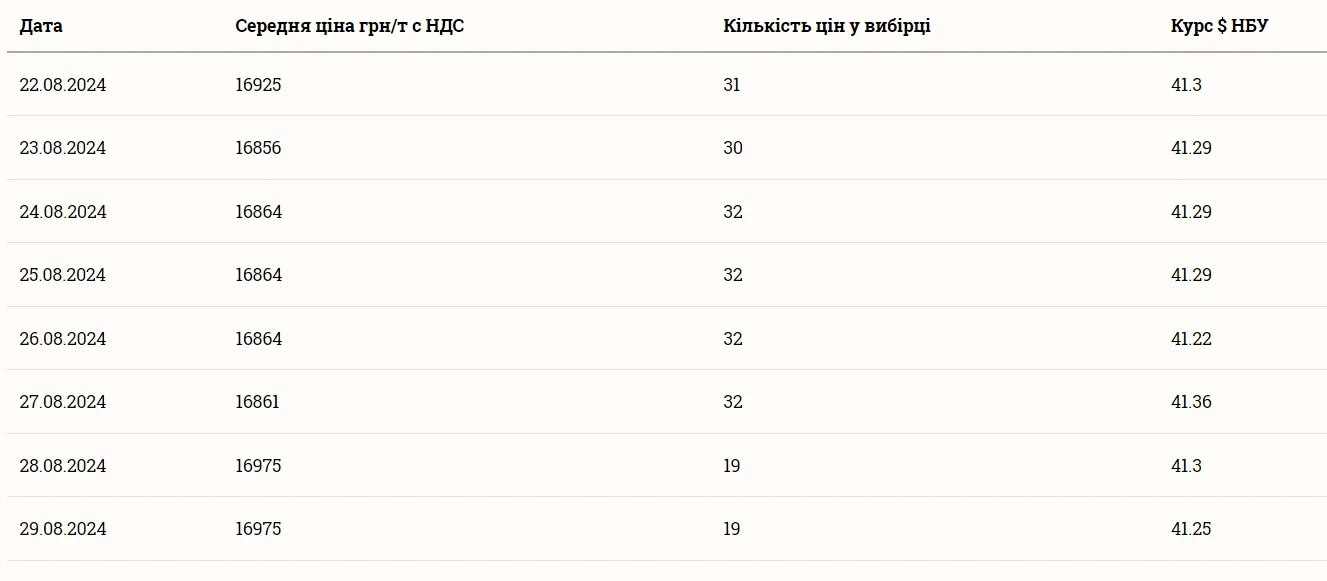 Згідно з останніми даними, у середу, 21 серпня, ціна на сою досягла тижневого максимуму – 16 927 гривень за тонну. Однак уже 23 серпня вона впала до 16 856 гривень за тонну, досягнувши тижневого мінімуму.
