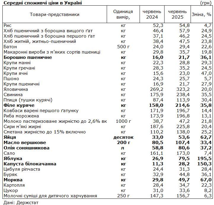 Зокрема, ціни на яблука зросли за останній рік майже у три рази (на 195,5%) до 79,5 гривень за кілограм. Водночас капуста подорожчала у 2,5 раза до 28,2 гривні за кілограм. Ціна на моркву збільшилась на 67,0% до 49,7 гривні за кілограм.