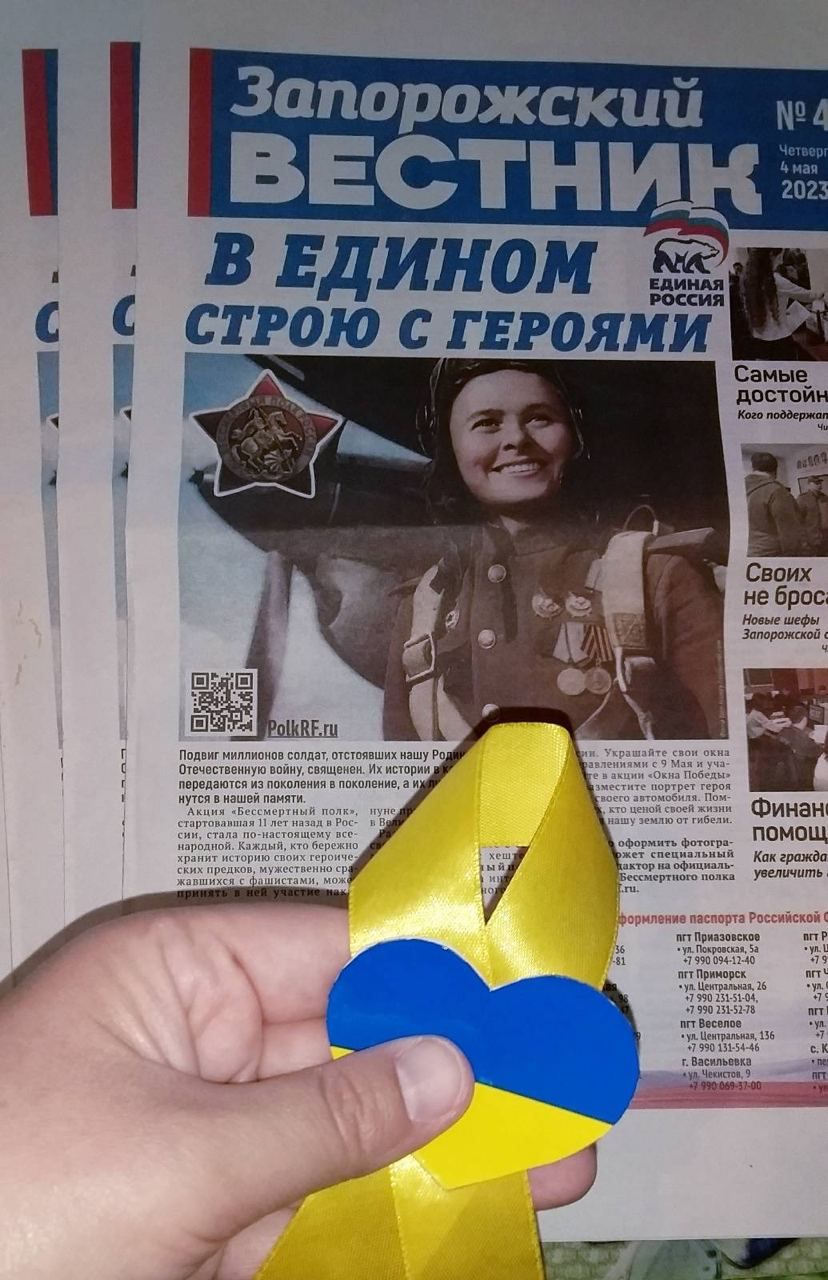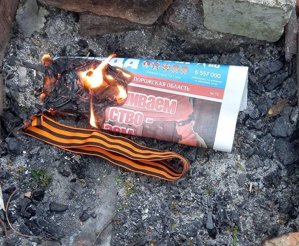 Рух громадянського спротиву на тимчасово окупованих територіях України "Жовта стрічка" показав, що жителі Мелітополя знищують російську макулатуру та символіку ворога.