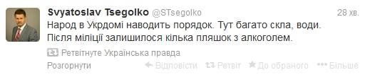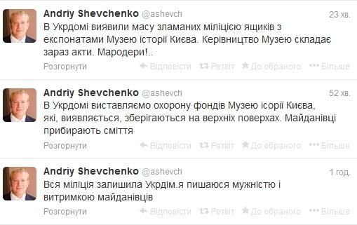"В Укрдомі виставляємо охорону фондів Музею історії Києва, які, виявляється, зберігаються на верхніх поверхах. Майданівці прибирають сміття. (...)", — пише нардеп і додає, що "в Укрдомі виявили масу зламаних міліцією ящиків з експонатами", тож керівництво Музею складає акти.