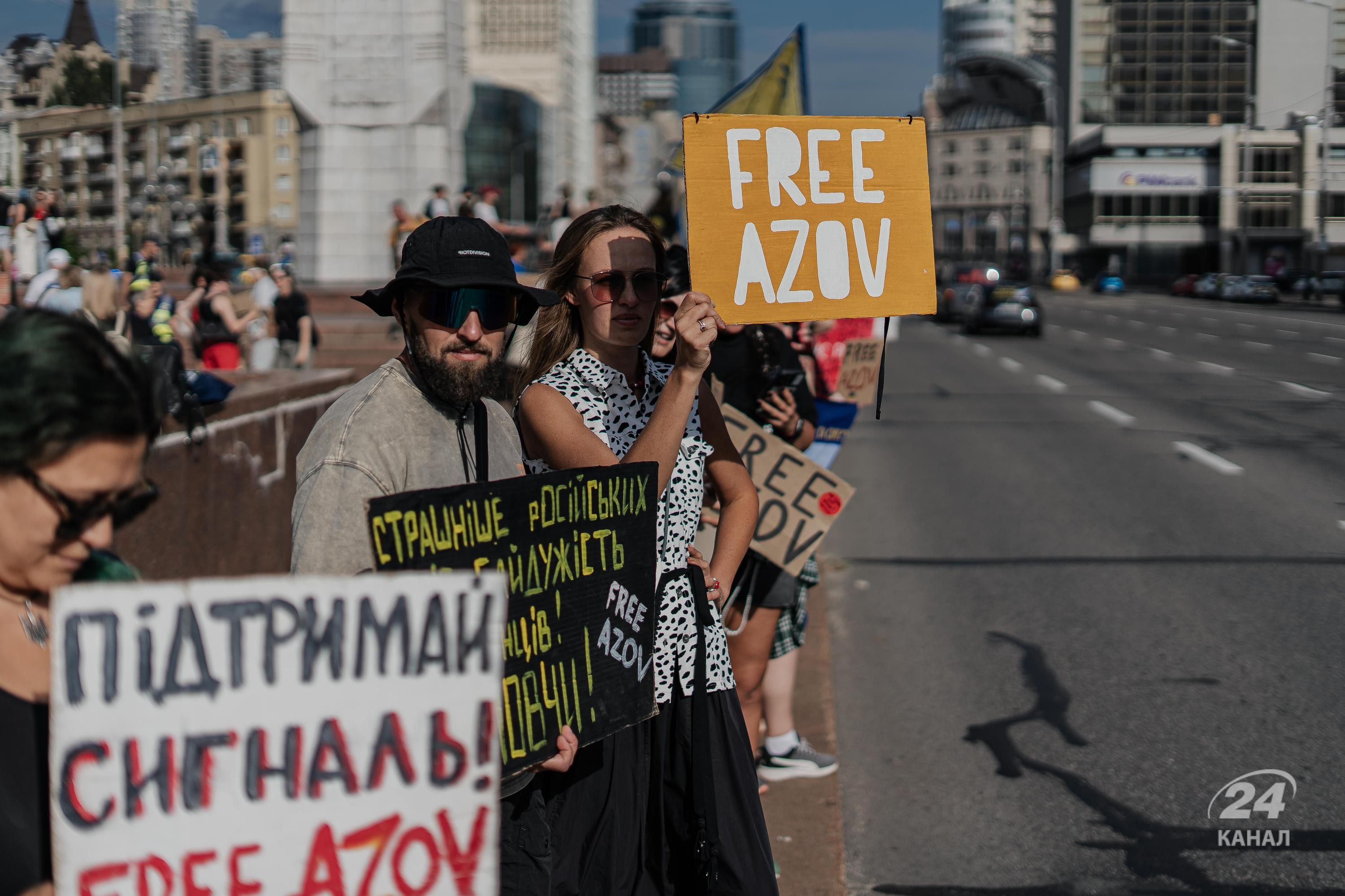 На численних плакатах, які принесли люди на акцію, були імена українських військовополонених, їхні фото, а також надписи: "Free Azov", "Сигналь, поки ще є кому чути", "Поверніть наших Героїв додому" тощо.