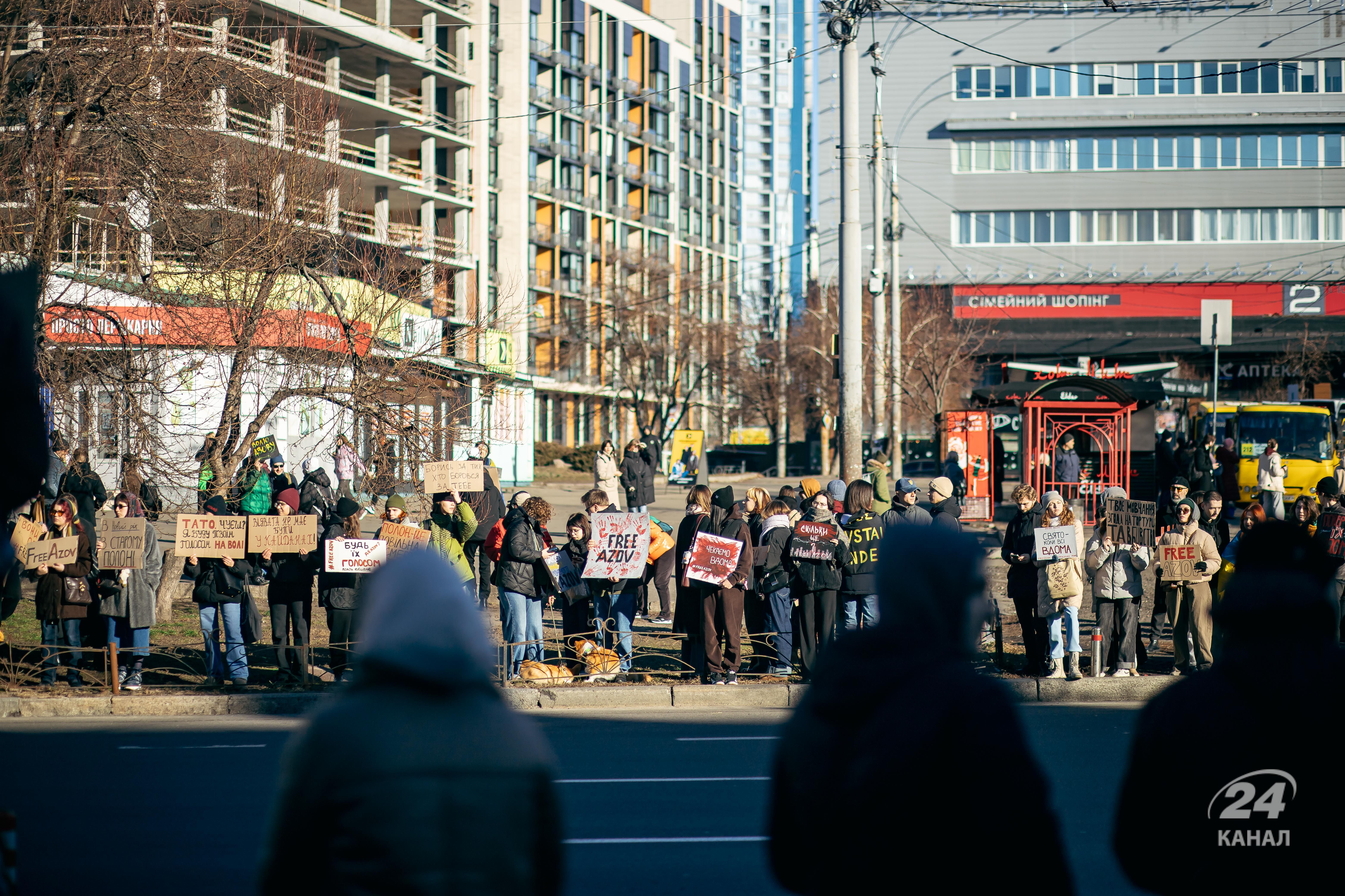 У руках українців були плакати, на яких було написано: "Я голос полонених, а ти?", "Free Azov", "Полонені мають бути звільнені вже", "Ціна твого життя – їх пекло щодня", "Мовчання вбиває" тощо.
