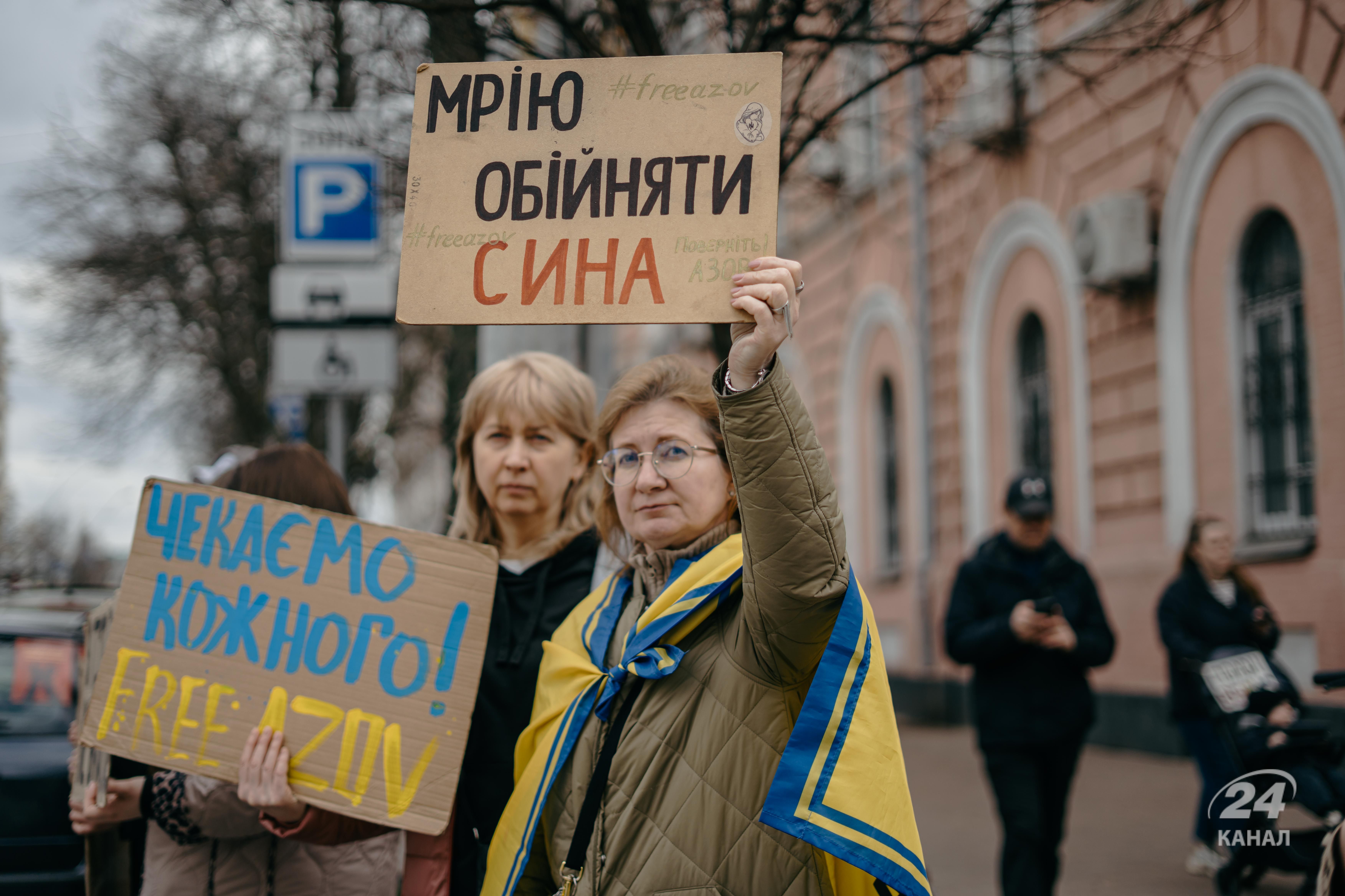 Люди тримали у руках емблеми військових бригад, фото своїх рідних та плакати із написами: "Де Азов?", "Волю героям", "Болить за тих, хто в полоні", "Полон вбиває, просто поки не тебе", "Борімося за повернення кожного" тощо.