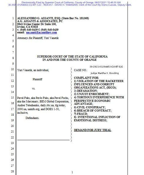 Американський адвокат, експерт і політичний консультант, що спеціалізувався по Східній Європі та Кавказу, подав позовну скаргу до Верховного суду округу Оранж, штату Каліфорнія Сполучених штатів Америки, з метою захисту себе та своєї ділової репутації від нападів з боку українського олігарха Павла Фукса. Повідомлення про це з'явилося на сайті суду.