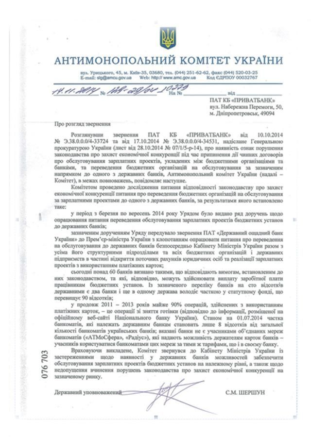 АМКУ звернувся до уряду з вимогою забезпечити дотримання діючого законодавства про захист економічної конкуренції на ринку банківського обслуговування державних підприємств і їх співробітників. Як ідеться в листі, підписаному державним уповноваженим АМКУ Сергієм Шершуном, дії уряду, спрямовані на примусове переведення бюджетників у державні банки, не тільки суперечать закону, але й можуть створити перешкоди для вільного доступу людей до особистих коштів.
