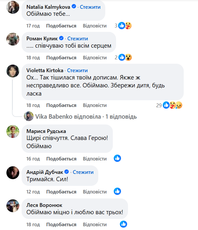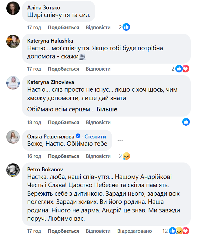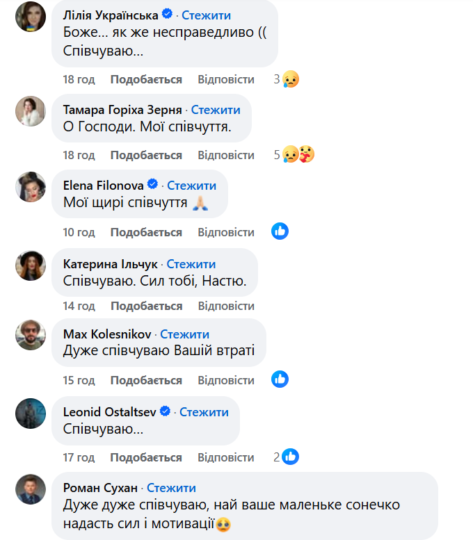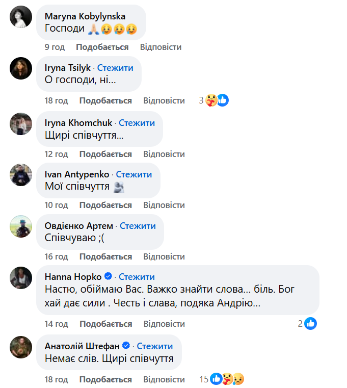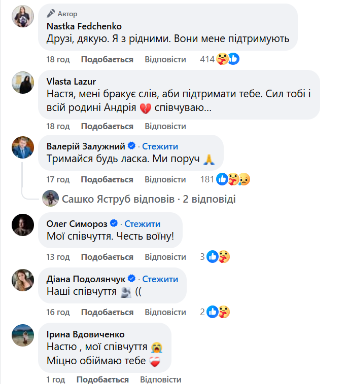 У коментарях до допису про втрату Анастасії своє співчуття також висловив ексголовком, а нині посол у Британії Валерій Залужний. Він написав: "Тримайся будь ласка. Ми поруч". Заступниця міністра оборони Наталія Калмикова написала: "Обіймаю тебе…" Військова омбудсменка Ольга Решетилова написала таке: "Боже, Настю. Обіймаю тебе".