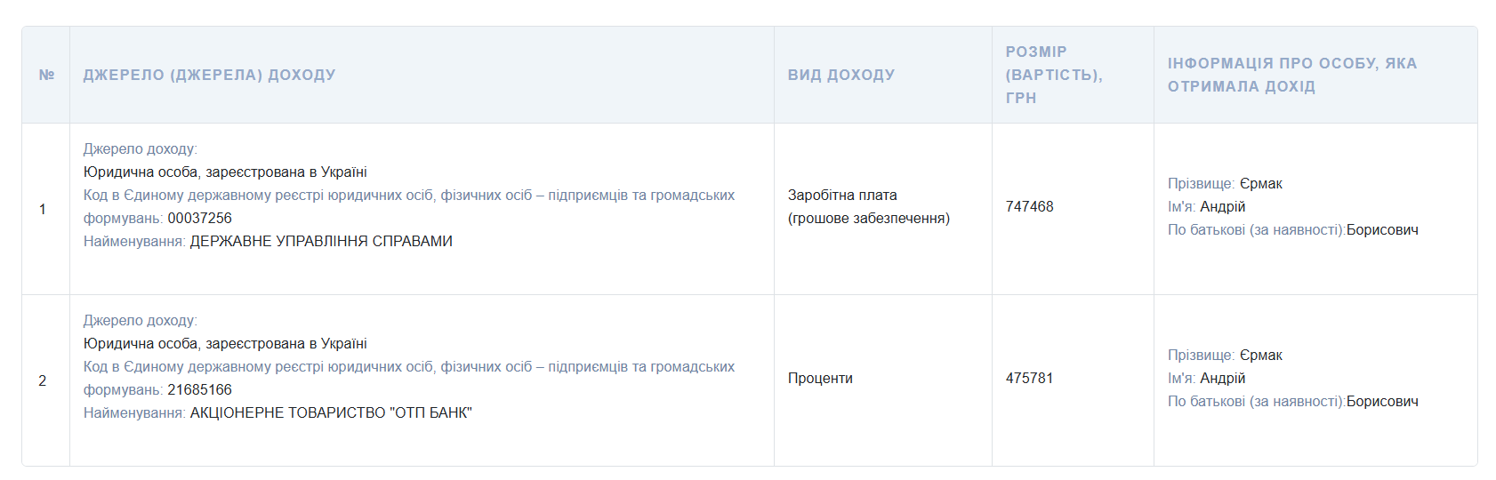 Скільки заробив Єрмак у 2025 році?
