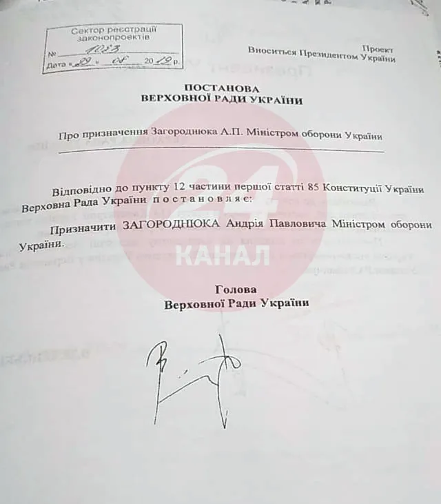 Проект постанови про призначення свого позаштатного радника Загороднюка на посаду очільника Міноборони президент вніс у Раду сьогодні, 29 серпня.